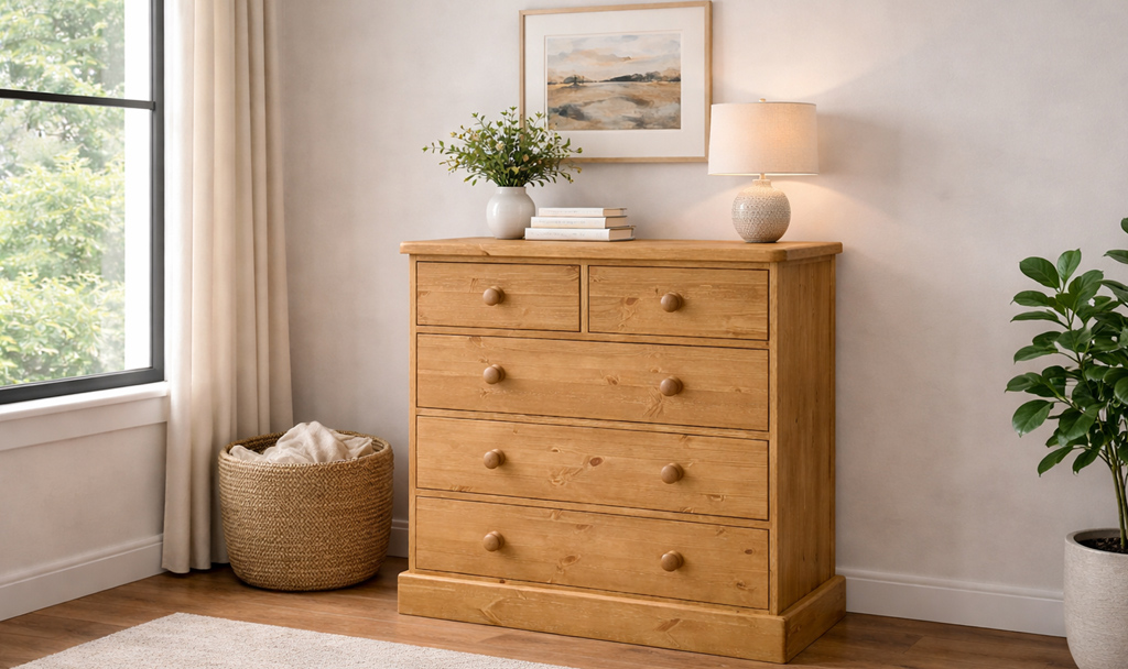 Unique to Green Woods Furniture, this solid (PEFC certified) pine chest of drawers, is handmade in Somerset and features dovetails on every drawer.